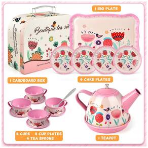 O conjunto de brinquedos para chá é feito de material de lata não tóxico e inofensivo de qualidade premium, com boca de copo lisa e estojo de transporte com alça de liga para fácil transporte. Todas as peças podem ser facilmente limpas com pano úmido e secas ao ar após o uso.