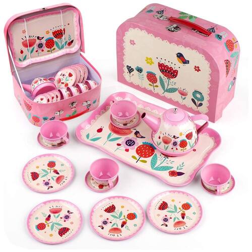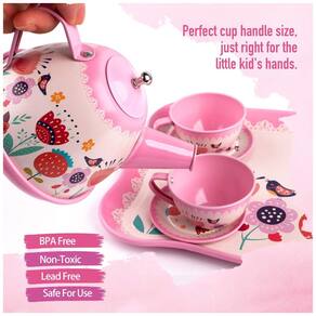 Este adorável conjunto de chá para crianças é composto por 15 peças, incluindo um bule, uma bandeja, quatro pires, quatro xícaras de chá e quatro pratos. As crianças podem brincar de faz de conta por horas e guardar cuidadosamente o conjunto em sua mala de papelão após a festa do chá. Feito de material de ferro revestido de estanho seguro, este conjunto de chá de lata para crianças de 3 a 5 anos é durável e resistente a quebras. Os copos têm um tamanho compacto perfeito para as crianças praticarem beber em copos abertos. O conjunto tem um lindo padrão de flores e é perfeito para meninas de todas as idades. É uma ótima maneira de desenvolver habilidades cognitivas, sociais, físicas e emocionais, inspirando pensamento criativo sem fim, compartilhamento, cooperação e dramatização. É o presente ideal para aniversários, Dia de Ação de Graças, Halloween, Natal e feriados de ano novo. A mala ficará ótima em um quarto de criança, sala de jogos ou berçário no parapeito da janela ou em uma prateleira.