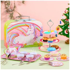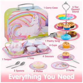 Este pacote de super valor inclui um conjunto de chá de unicórnio composto por 1 bule, 4 xícaras, 4 pratos de tamanho médio, 4 pratos de tamanho pequeno, 1 prato grande e uma caixa de papelão de unicórnio, 2 colheres, 2 garfos, um suporte para bolo de 3 camadas, 1 servidor de pastelaria, 5 cupcakes, 4 pães doces e 4 doces. O conjunto é decorado com um unicórnio mágico, arco íris e outros castelos encantadores, o que certamente irá encantar e inspirar seus pequenos unicórnios. Este adorável conjunto de latas de brinquedo foi projetado para brincadeiras de faz de conta, incentivando as crianças a usar a imaginação e melhorar sua criatividade e habilidades sociais. O conjunto de chá festa unicórnio é fácil de ser guardado e transportado, além de ser super durável e durar anos de diversão em festas de chá internas e externas. É perfeito para armazenamento de brinquedos, decoração de quartos, presentes de aniversário e outras ocasiões temáticas de unicórnio.
