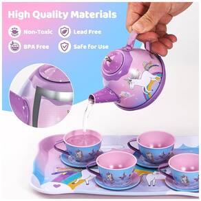 O conjunto de chá de princesa Quiet Flower é feito de ferro revestido de estanho de alta qualidade e plástico sem BPA. Cada conjunto passou por um processo de produção rigoroso para garantir bordas lisas e sem rebarbas, tornando a experiência de festa de chá segura e sem preocupações para as crianças. O brinquedo de simulação de cozinha infantil permite que as crianças aproveitem a diversão do RPG, preparando seus petiscos favoritos para satisfazer a fome e a sede na brincadeira. O conjunto de festa de chá infantil é adequado para 4 pessoas brincarem, crianças e pais participam juntos, estimulando a criatividade das crianças, desenvolvendo a cognição, promovendo o trabalho em equipe e melhorando as habilidades de linguagem e comunicação. O conjunto inclui bules, xícaras ou xícaras de café, pratos, colheres, suportes para bolo em camadas, sobremesas, toalhas de mesa e até mesmo bastões de fada da princesa e tiaras de unicórnio, tornando o uma escolha única para uma festa de chá de princesa inesquecível. O conjunto vem com uma linda caixa de armazenamento portátil, tornando os brinquedos ordenados, fáceis de organizar e transportar. É o presente perfeito para uma menina de 3 a 12 anos em ocasiões como aniversários, Páscoa, Natal ou Ano Novo, tornando sua viagem cosplay mais emocionante e cheia de boas lembranças.