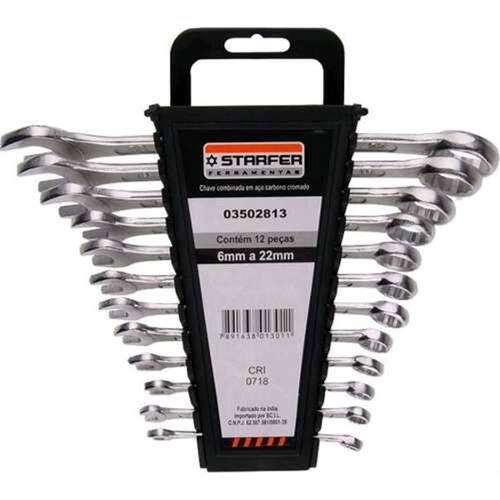 Jogo de chave combinada Starfer com 12 peças, indicada para aperto e desaperto de porcas, parafusos quadrados e sextavados. Chave combinada. Medidas: 6-7-8-9-10-11-12-13-14-17-19-22mm. Tipo: Boca e Estrela. Indicado para: parafusos e porcas sextavados e quadrados. Marca: Starfer Qtd: 12 pçs Código: 03502813 Marca: Não Informado Ean: 7909389081552