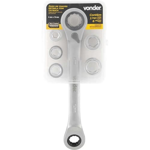 Produzido em aço cromo vanádio e com acabamento cromado fosco, o Jogo de Chaves Estrela VONDER oferece melhor qualidade, durabilidade e maior resistência à oxidação/corrosão. Conta com sistema de catraca, que permite apertar e soltar parafusos e porcas sem necessidade de retirar a chave, proporcionando a realização de trabalhos com mais facilidade e agilidade. Além disso, possui mais pontos de fixação que distribuem uniformemente a força aplicada na parte central do sextavado, evitando deformação dos cantos das porcas e parafusos.
