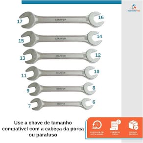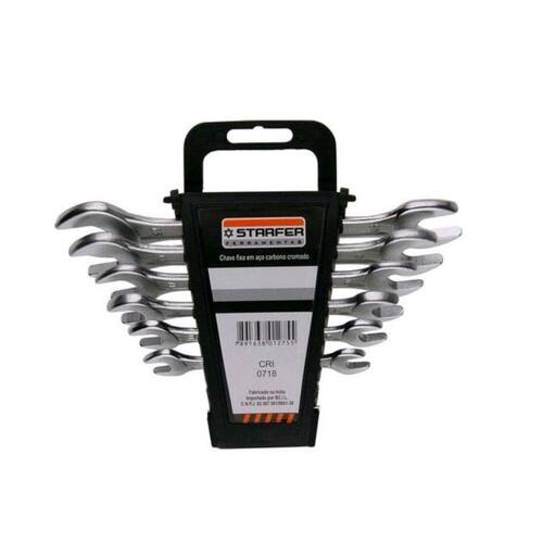 A Chave fixa é ideal para aperto e desaperto de parafusos ou porcas com perfil quadrado ou sextavado. Fabricado em aço carbono oferece durabilidade e resistência, para funcionamento adequado é necessário usar a chave de tamanho compatível com a cabeça da porca ou parafuso.Características técnicas:Material: Aço carbono níquel-cromadoMedidas: 6 a 17mmQuantidade: 6 peças + suporte plásticoTipo de chave: FixaMarca: StarferRef.: 3502252Conteúdo da Embalagem:• 01 Suporte plástico• 01 Chave fixa de 6x7mm• 01 Chave fixa de 8x9mm• 01 Chave fixa de 10x11mm• 01 Chave fixa de 12x13mm• 01 Chave fixa de 14x15mm• 01 Chave fixa de 16x17mm
