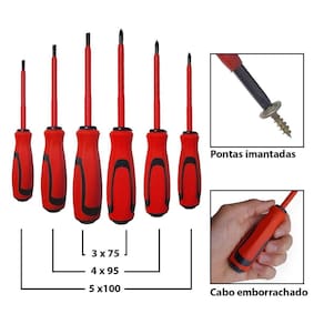 Mantenha sua segurança em primeiro lugar com o nosso Jogo de Chaves Philips e Fenda Isoladas, desenvolvido especialmente para eletricistas e profissionais que atuam em serviços elétricos. Seguindo as normas NR10, este conjunto é ideal para quem busca qualidade e proteção em suas atividades. O jogo contém 6 peças sendo 3 com pontas philips e 3 com pontas fenda. 1 fenda e 1 philips na medida 3 x 75 mm 1 fenda e 1 philips na medida 4 x 95 mm 1 fenda e 1 philipas na medida 5 x 100 mm Características: Isolamento Elétrico: Cada chave possui isolamento, garantindo segurança em trabalhos com eletricidade. Material de Alta Qualidade: Fabricadas em aço de alta resistência, proporcionando durabilidade e desempenho superior. Design Ergonômico: Cabos antiderrapantes que oferecem maior conforto e firmeza durante o uso. Variedade de Tamanhos: Inclui diferentes tamanhos de chaves Philips e fenda, atendendo a diversas aplicações. Benefícios: Segurança Garantida: Proteja-se contra descargas elétricas e trabalhe com confiança. Praticidade: Ideal para uso em instalações elétricas, reparos e manutenção. Confiabilidade: Ferramentas projetadas para suportar as exigências do dia a dia. Especificações: Modelo: Jogo de Chaves Isoladas Philips e Fenda Norma: NR10 Quantidade: 6 peças 3 philips / 3 fenda Porque Escolher Nosso Jogo de Chaves Isoladas Com nosso jogo de chaves, você investe em segurança e qualidade, essenciais para o trabalho de eletricista. Não deixe sua proteção em segundo plano. Adquira já o seu e trabalhe com a confiança que você merece Marca: Bomvink Marca: Bomvink