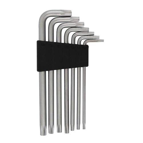 Características: - Material: Aço cromo vanádio e PP - Cor: Prata - Tipo de Embalagem: Blister - Jogo contendo 7 Chaves: - Tamanhos: T10 - T15 - T20 - T25 - T27 - T30 - T40 - Acompanha suporte para guardar as chaves. - Profissional (PRO). - Com furo. - Com prático suporte para guardar as chaves.