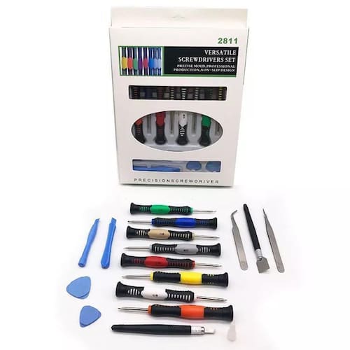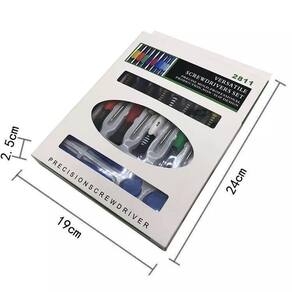 Jogo De Chaves 16 em 1 De Precisão Para Conserto Celulares Kit Jogo De Chaves De Precisão Para Conserto Celulares 2811 Descrição Kit De Ferramentas Para Equipamentos Eletrônicos Em Geral Contendo 8 Chaves Diversas Para Melhor Desenvolvimento Em Seu Trabalho, Além De Outros Acessórios Contidos Na Embalagem Do Produto, Como Paletas, Pinças E Espatulas. - Apropriado para todos os telefones celulares, iPhone, Samsung, Motorola, LG, Lenovo, HTC, Blackberry e etc. Características: - Uso Prático - Portátil - Contém 8 Chaves De Precisão Contém: - 8 Chaves de precisão; - 1 Pinça Reta; - 1 Pinça Curva; - 2 Espátulas de plástico - 2 Triângulos de plástico - Estiletes Equipamento Indicado Para O Uso Em: Celulares / Notebook / Computador / Relógios / Ipad / Robotica / Equipamentos Eletronicos Em Geral. Imagens Ilustrativas Especificações Técnicas: Contém: - 8 Chaves de precisão; - 1 Pinça Reta; - 1 Pinça Curva; - 2 Espátulas de plástico - 2 Triângulos de plástico - Estiletes Ean: 7899899900057 Marca: Não Informado
