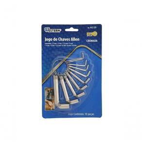 Descricao Antes do uso: Verificar se o produto esta em perfeita condicoes de uso. Perigos: Cuidado durante o manuseio do produto para evitar acidentes. Cuidados: Para reduzir risco de lesoes, sempre use adequadamente equipamentos de protecao individual (oculos de protecao Botas, mascara, luvas etc.) necessarios no trabalho; Use o tipo e tamanho correto de ferramenta para cada tipo de trabalho. Nao force a ferramenta; A ferramenta correta fara o trabalho melhor e mais seguro se utilizada para aquilo que foi projetada; Armazene em local seguro, seco, fresco e longe de umidade; Guarde estas instrucoes para futuras consultas; Manter fora do alcance das criancas. *Imagens meramente ilustrativas. Especificacao Tecnica Contem: 10 Chaves Allen: 1,5mm, 2mm, 2,5mm, 3mm, 4mm, 5mm, 5,5mm, 6mm, 8mm e 10mm Tipo de Embalagem: Blister Dimensoes da Embalagem: 12,5 x 1,6 x 21cm (CxLxA) Quantidade Inner: 25 Pecas Dimensoes Inner: 30 x 14 x 14,5cm (CxLxA) Quantidade Master: 100 Pecas Dimensoes Master: 32,5 x 30 x 30,5cm (CxLxA) Material: Aco carbono Cor: Prata Marca: Western Origem: China