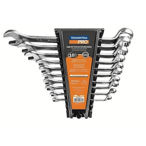 Forjada em aço cromo vanádio e temperada. Cabeça usinada. Pescoço longo. Acabamento cromado. Abertura da boca calibrada. DIN 3113. Suporte plástico. O jogo contém 10 Chaves Combinadas dos seguintes tamanhos: 6, 8, 10, 11, 12, 13, 14, 17, 19, 22.