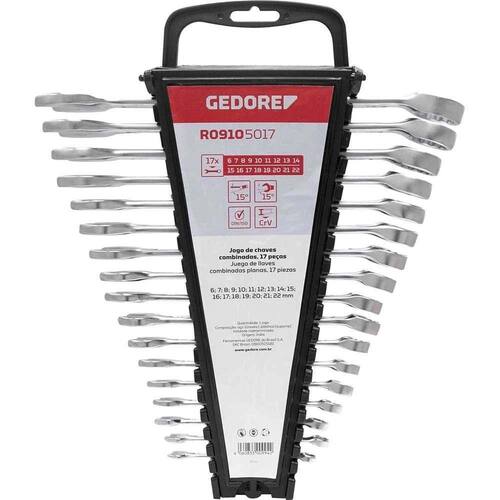 Conteúdo da embalagem: 1 Jogo de chaves combinadas, composto por um estojo plástico com 17 peças, sendo: 6 mm, 7 mm, 8 mm, 9 mm, 10 mm, 11 mm, 12 mm, 13 mm, 14 mm, 15 mm, 16 mm, 17 mm, 18 mm, 19 mm, 20 mm, 21 mm e 22 mm.