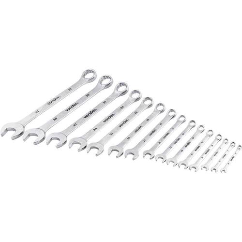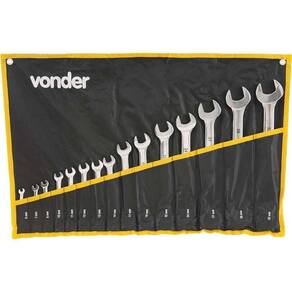 Conteúdo da embalagem: 1 Jogo de chaves combinadas composto por um estojo em lona com 15 peças, sendo: 6 mm, 7 mm, 8 mm, 10 mm, 11 mm, 12 mm, 13 mm, 14 mm, 17 mm, 19 mm, 22 mm, 24 mm, 27 mm, 30 mm e 32 mm.