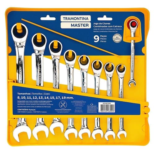 Essencial para o setor da construção civil, o Jogo de Chaves Combinadas com Catraca 9 Peças Tramontina MASTER entrega versatilidade, precisão e resistência em serviços profissionais. Com catraca de 72 dentes e tamanhos de 8 a 19 mm, é ideal para montagens metálicas, ajustes hidráulicos e reparos estruturais em obras. Forjadas em aço cromo vanádio e com acabamento cromado, as ferramentas garantem alto desempenho e longa durabilidade. Com a Tramontina MASTER, você tem a confiança de uma marca que entende de ferramenta robusta e de qualidade.