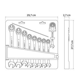 Forjada em aço cromo vanádio e temperada. Catraca com 72 dentes. Cabeça usinada. Acabamento cromado. Catraca fosfatizada. DIN 3113. Conteúdo: 8, 10, 11, 12, 13, 14, 15, 17 e 19 mm.