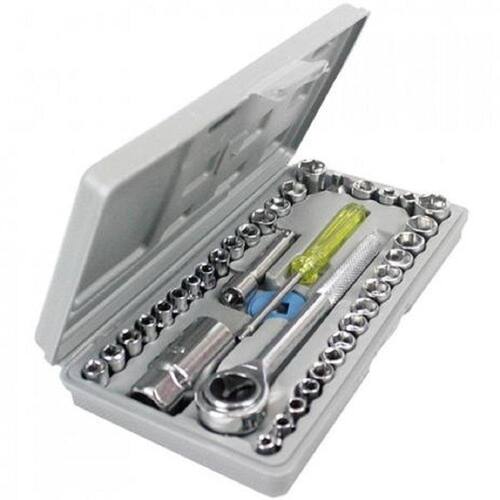 O Kit de Chaves com Catraca Reversível é composto dos seguintes itens: - Maleta com 40 peças - Marca SQ - Modelo SQ 1992 - Maleta completo e essencial para trabalhos profissionais e domésticos - Construído em aço , super resistente - Catraca reversível - Soquetes - Kit completo com: 1 Peça - 3/8¨Chave Reversível 14 Peças - 1/4¨ Soquetes de Encaixe: 4, 4.5, 5, 5.5,6, 6.5, 7, 7.5, 8, 9,10, 11, 12, 13mm 14 Peças - 1/4¨Soquetes de Encaixe: 5/32, 3/16, 7/32, 1/4, 9/32, 5/16, 11/32, 3/8, 13/32, 7/16, 15/32, 1/2, 17/32, 9/16¨ 3 Peças - 1/4¨Soquetes de Encaixe (BPT): 1/4, 5/16, 3/8¨ 1 Peça - 3/8¨ Barra Extensora 3¨ 1 Peça - 1/4 3/8¨ Adaptador 1 Peça - 3/8¨ Vela de Ignição 21mm 1 Peça - 6¨ Punho 2 Peças - 3/8¨ Soquetes de Encaixe: 15mm 16mm 1 Caixa de Plastico