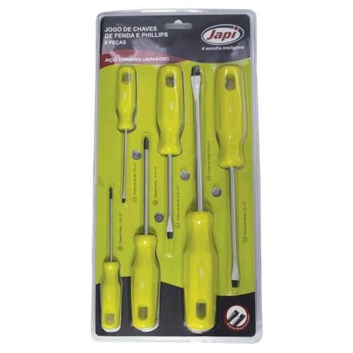 Tipo: Jogo de chaves de fenda e PhillipsComposição: Chaves de diferentes tamanhos e tipos de pontaQuantidade de Peças: 6Marca: JapiUso: Apertar e desapertar parafusos diversosEspecificações: