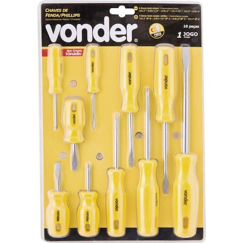 Jogo de chaves de fenda e phillips com 10 peças VonderIndicado para fixar e soltar parafusos fenda e phillipsProduzido em aço cromo vanádio, proporcionando maior resistência e durabilidade. Possui acabamento niquelado que aumenta a proteção contra oxidação/corrosão. Conta com ponta magnetizada que facilita tanto a colocação quanto a retirada de parafusos em locais de difícil acesso, além de cabo anatômico em polipropileno que garante maior conforto ao operador.Conteúdo da Embalagem:1 Jogo de chaves de fenda/phillips, composto por 10 peças, sendo: 6 chaves de fenda (1/8 x 2, 3/16 x 1.1/2 (toco), 3/16 x 3, 1/4 x 1.1/2 (toco), 1/4 x 4 e 5/16 x 6) e 4 chaves phillips (1/8 x 2, 3/16 x 1.1/2 (toco), 3/16 x 3 e 1/4 x 4)Material do jogo de chave fenda e phillips: Aço cromo vanádioAcabamento do jogo de chave de fenda e phillips: NiqueladoMaterial do cabo da chave: PolipropilenoCor do cabo da chave: Amarelo