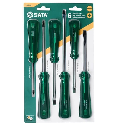Produto: Jogo de chaves de fenda e phillips com 6 peças - ST08044L Marca: Sata Descrição: O Jogo de Chaves Fenda e Phillips 6 peças ST08044L da SATA é o mix essencial de chaves retas para os profissionais que prezam pela praticidade e qualidade em seu trabalho. Ideal para os profissionais que precisam realizar reparos geral, sua ponta magnética facilita o agarre aos parafusos e a inserção em locais de difícil acesso, garantindo que não caia devido a parte imantada. Além disso, a ponta possui um acabamento oxidado, proporcionando maior resistência. Seu acabamento niquelado e cromado, oferece mais resistência contra descascamento e corrosão proporcionando maior durabilidade e segurança ao usuário. Seu cabo ergonômico e antideslizante facilita o ajuste das mãos e aumenta o torque durante o uso. Características: • Possui haste temperada por toda sua extensão • Acabamento niquelado e cromado: mais fácil de limpar. • Possui ponta magnética oxidada, diminuindo a possibilidade de descascamento e proporcionando maior segurança. • Haste fabricada em Cromo-Vanádio Cr-V garantindo maior resistência e durabilidade. • Cabo Translúcido em PVC: alta resistência a quedas e ressecamentos, além de tornar visível o aterramento da haste. • Cabo ergonômico que garante menos esforço e muito mais torque, ideal para trabalhos pesados. • Atende e supera norma - ASME B107.600 / DIN 3125Especificações: Material: Aço cromo vanádioMaterial do cabo: Translúcido em PVC4 Chave fenda: 1/4"x6", 1/8"x3.1/8", 1/4"x4", 3/16x4"2 Chave Phillips: 3/16"x3.1/8", 1/4"x5".