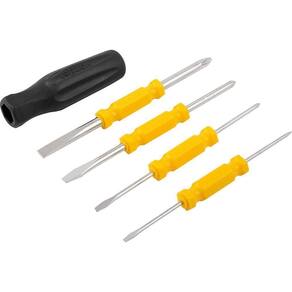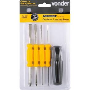 1 Jogo de chaves de fenda/phillips composto por uma cartela com 5 peças, sendo: 1 chave ponta de fenda e furador 1/10 - 2,54 mm (precisão) , 1 chave ponta de fenda e ponta phillips 1/8 - 3,18 mm (N 0) , 1 chave ponta de fenda e ponta phillips 3/16 - 4,76 mm (N 1), 1 chave ponta de fenda e ponta phillips 1/4 - 6,35 mm (N 2) e 1 cabo adaptador