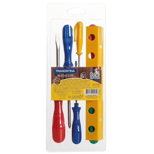 Existe ferramenta mais básica e ao mesmo tempo imprescindível para o seu dia a dia do que a chave de fenda? Com certeza não! E o Jogo de Chaves de Fenda Tramontina Basic 6 Peças traz para você 5 chaves diferentes, de diversos tamanhos e com alta resistência. O jogo conta também com um suporte de parede para suas ferramentas, o que irá facilitar a sua organização e na hora de escolher a chave certa. Não deixe de ter o melhor em sua casa, garanta o seu! Orientações As hastes das chaves de fenda são testadas em máquinas de ensaio específicas, para verificar o perfeito balanço entre resistência mecânica e dureza.Cabos injetados com material de alta resistência.Os dimensionais das pontas são verificados comgabaritos-padrão, calibrados e certificados.As ferramentas são produzidas e testadas conforme normas específicas.Inclui suporte plástico para chaves de fenda. Observações Use óculos, luvas e outros equipamentos de proteção de acordo com a tarefa a ser executada. Utilize chaves de fenda isoladas, identificadas pela marcação 1.000 V, quando for necessário trabalhar em locais com corrente elétrica. Importante: nestes casos, inspecione a integridade da isolação elétrica, e, se aparecerem trincas na isolação, suspenda o uso imediatamente. Utilize chaves com ponta adequada para cada tipo de fenda, para realizar a tarefa de forma mais rápida e segura. Respeite o torque estabelecido por norma para cada bitola. Não utilize as chaves de fenda como formão ou alavanca. Não altere as dimensões originais da ponta para obter outro perfil. Armazene em local limpo e seco. Características Gerais EAN13 7891114042528 DUN14 17891114042525 NCM 8205.40.00 Peso Líquido 0,2100 kg. Peso Bruto 0,2100 kg. Metragem 0,000875 m³. Dimensões Embalagem (Compr. X Larg. X Alt.) 265x 110x 30 mm.