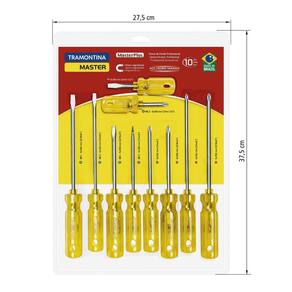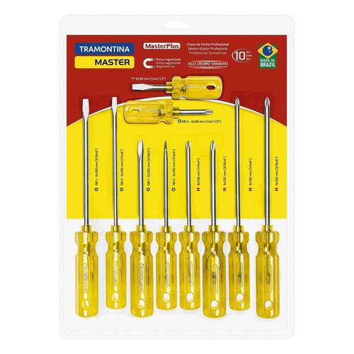 O Jogo de Chaves de Fenda Tramontina Masterplus em Aço Cromo Vanádio 10 Peças é completo para as exigências dos seus projetos e reparos da casa. Contendo 10 chaves de fenda, ele auxilia você na hora de apertar ou afrouxar parafusos. São peças de qualidade que tornam as tarefas mais práticas e funcionais. Orientações Haste em aço cromo vanádio temperada. Cabo em PVC amarelo transparente. Acabamento cromado. Ponta magnetizada. DIN ISO 2380 Observações Sempre utilizar óculos de segurança para proteger os olhos. Sempre utilizar chaves de fenda isoladas, identificadas pela marcação 1.000 V, quando é necessário trabalhar em um local que tenha corrente elétrica. Utilizar chaves com ponta adequada para cada tipo de fenda, para realizar a tarefa de forma mais rápida e segura. Respeitar o torque estabelecido por norma para cada bitola. Características Gerais EAN13 7891114153224 DUN14 17891114153221 NCM 8205.40.00 Peso Líquido 0,9160 kg. Peso Bruto 0,9450 kg. Metragem 0,004125 m³. Dimensões Embalagem (Compr. X Larg. X Alt.) 375x 275x 40 mm.