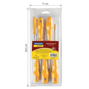 Jogo De Chaves De Fenda Tramontina Yellow 6 Peças Tramontina Jogo de Chaves de Fenda Tramontina Yellow 6 Peças Tramontina - Se você preza por um completar seu kit de ferramentas, precisa do Jogo de Chaves de Fenda Tramontina Yellow 6 Peças. Um jogo que traz chaves de fenda com ponta chata, ponta cruzada e ainda uma chave clipe, ideal para fixar em cintos e alças e que é um coringa na hora de apertar ou afrouxar parafs. Todas as peças são muito resistentes: têm hastes produzidas em aço especial cromado e cabos em polipropileno injetado. Além disso, são altamente duráveis e vão levar muito mais praticidade na execução de suas tarefas. Garanta o seu e facilite o seu dia a dia!OrientaçõesAs hastes as chaves de fenda são testadas em máquinas de ensaio específicas, para verificar o perfeito balanço entre resistência mecânica e dureza. Cabos injetados com material de alta resistência. Os dimensionais das pontas são verificados comgabaritos-padrão, calibrados e certificados. As ferramentas são produzidas e testadas conforme normas específicas.ObservaçõesUse óculos, luvas e outros equipamentos de proteção de acordo com a tarefa a ser executada. Utilize chaves de fenda isoladas, identificadas pela marcação 1.000 V, quando for necessário trabalhar em locais com corrente elétrica. Importante: nestes casos, inspecione a integridade da isolação elétrica, e, se aparecerem trincas na isolação, suspenda o imediatamente. Utilize chaves com ponta adequada para cada tipo de fenda, para realizar a tarefa de forma mais rápida e segura. Respeite o torque estabelecido por norma para cada bitola. Não utilize as chaves de fenda como formão ou alavanca. Não altere as dimensões da ponta para obter outro perfil. Armazene em local limpo e seco.Características GeraisEAN137891114029925DUN1417891114029922NCM8205.40.00Peso Líquido0,2000 kg.Peso Bruto0,2000 kg.Metragem0,001174 m.Dimensões Embalagem (Compr. X Larg. X Alt.)305x 110x 35 mm.Cor 1FFD200 Hexa Características Gerais do Produto: Garantia: - 1 Ano