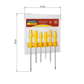 Tenha materiais práticos e funcionais perto de você! O Jogo de Chaves de Fenda Tramontina Yellow com Suporte 6 Peças traz ferramentas utilitárias que auxiliam em diferentes projetos. São seis chaves de fenda produzidas com materiais de qualidade e bom gosto. O jogo traz 4 chaves de fenda ponta chata e 2 chaves de fenda ponta cruzada, ideais para as necessidades que você encontrar! Ter esse jogo sempre à mão vai tornar seu dia a dia mais prático! Orientações As hastes as chaves de fenda são testadas em máquinas de ensaio específicas, para verificar o perfeito balanço entre resistência mecânica e dureza.Cabos injetados com material de alta resistência.Os dimensionais das pontas são verificados com gabaritos-padrão, calibrados e certificados.As ferramentas são produzidas e testadas conforme normas específicas.Possui suporte de parede para facilitar o armazenamento das chaves de fenda. Observações Use óculos, luvas e outros equipamentos de proteção de acordo com a tarefa a ser executada. Utilize chaves de fenda isoladas, identificadas pela marcação 1.000 V, quando for necessário trabalhar em locais com corrente elétrica. Importante: nestes casos, inspecione a integridade da isolação elétrica, e, se aparecerem trincas na isolação, suspenda o uso imediatamente. Utilize chaves com ponta adequada para cada tipo de fenda, para realizar a tarefa de forma mais rápida e segura. Respeite o torque estabelecido por norma para cada bitola. Não utilize as chaves de fenda como formão ou alavanca. Não altere as dimensões originais da ponta para obter outro perfil. Armazene em local limpo e seco. Características Gerais EAN13 7891114140514 DUN14 17891114140511 NCM 8205.40.00 Peso Líquido 0,3000 kg. Peso Bruto 0,4000 kg. Metragem 0,000300 m³. Dimensões Embalagem (Compr. X Larg. X Alt.) 200x 150x 10 mm. Cor 1 FDD200 Hexa