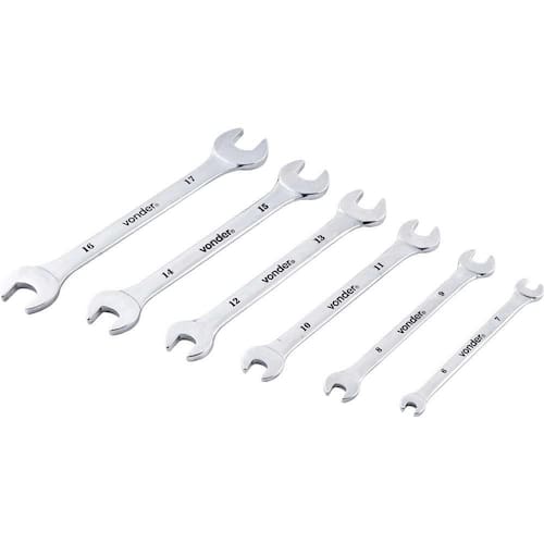 Quantidade: 6 peças | Medidas (mm/pol): 6 mm x 7 mm, 8 mm x 9 mm, 10 mm x 11 mm, 12 mm x 13 mm, 14 mm x 15 mm e 16 mm x 17 mm | Material : Aço cromo vanádio | Acabamento: Cromado | Segue norma(s) (nome/sigla): DIN 3110 | Massa aproximada (peso) (kg): 0.44