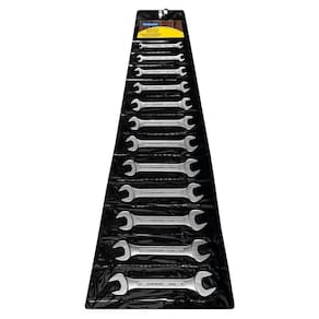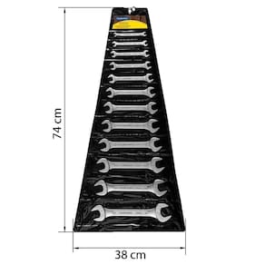 O kit contém 12 chaves fixas com bocas calibradas em diferentes tamanhos, incluindo bitolas métricas e em polegadas, permitindo o uso em diversos tipos de parafusos e porcas.