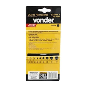 O formato em "L" permite a aplicação de alavanca para torques maiores, enquanto a grande variedade de medidas (1,5 mm a 10 mm) proporciona versatilidade para lidar com diversos tamanhos de parafusos. Construído em aço cromo vanádio com acabamento fosfatizado, o Jogo de Chaves Vonder oferece durabilidade extrema e alta resistência contra a oxidação. O suporte plástico incluso garante a organização e o transporte facilitado, otimizando o tempo de busca pela ferramenta certa.
