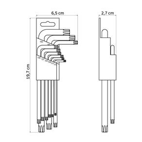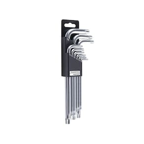 Corpo em aço cromo vanádio.Acabamento cromado.Embalagem injetada em PEBD.Conteúdo: T10, T15, T20, T25, T27, T30, T40, T45 e T50.