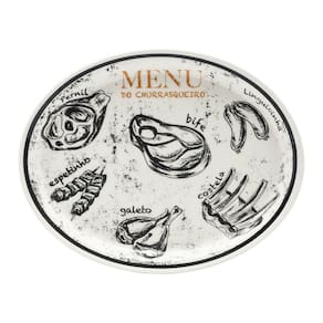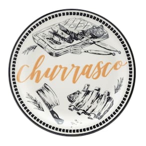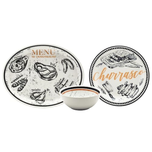 O conjunto conta com três peças essenciais para servir um bom churrasco: uma travessa espaçosa, quatro pratos rasos e um bowl perfeito para farofa ou vinagrete. A decoração tem a ilustração de peças normalmente assadas sobre o fogo ou brasa como a costelinha, galeto e linguicinha. Pode ser levado ao micro-ondas e a lava-louças.
