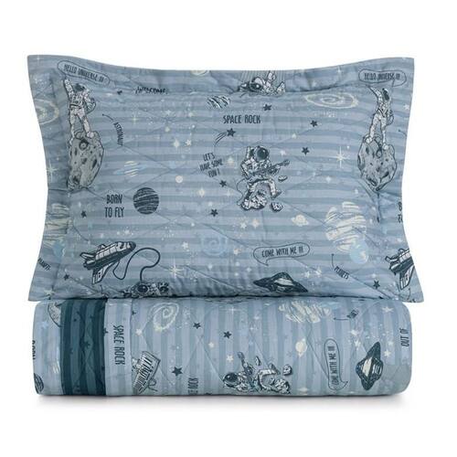 Jogo de Colcha Solteiro Infantil Espacial 200 Fios Karsten Jogo de Colcha Solteiro Infantil 200 Fios Karsten O jogo de colcha Espacial é uma explosão de criatividade e conforto. De um lado, o astronauta rockstar se apresenta em uma cena vibrante no espaço; do outro, uma padronagem listrada com estrelas garante versatilidade para diferentes composições. O porta-travesseiro acompanha o tema, reforçando a unidade visual. Com acabamento em matelassê e enchimento leve, esse conjunto é ideal para deixar o quarto mais lúdico e estiloso, sem abrir mão da praticidade no dia a dia. Contém:1 Colcha dupla face. Tamanho: 1,80m x 2,60m1 Porta Travesseiro. Tamanho: 50cm x 70cm Material: 200 fios, 100% algodão, Enchimento 100% PoliésterEstampa: EspacialMarca: Karsten Marca: Não Informado