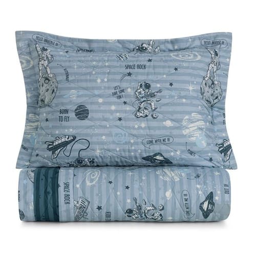 Jogo de Colcha Solteiro Infantil Espacial 200 Fios Karsten Jogo de Colcha Solteiro Infantil 200 Fios Karsten O jogo de colcha Espacial é uma explosão de criatividade e conforto. De um lado, o astronauta rockstar se apresenta em uma cena vibrante no espaço; do outro, uma padronagem listrada com estrelas garante versatilidade para diferentes composições. O porta-travesseiro acompanha o tema, reforçando a unidade visual. Com acabamento em matelassê e enchimento leve, esse conjunto é ideal para deixar o quarto mais lúdico e estiloso, sem abrir mão da praticidade no dia a dia. Contém:1 Colcha dupla face. Tamanho: 1,80m x 2,60m1 Porta Travesseiro. Tamanho: 50cm x 70cm Material: 200 fios, 100% algodão, Enchimento 100% PoliésterEstampa: EspacialMarca: Karsten Marca: Não Informado Ean: 7909156339244