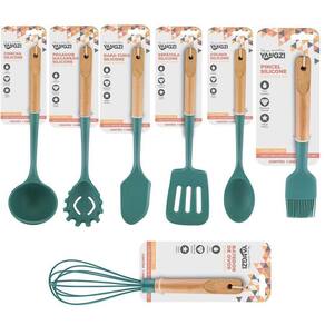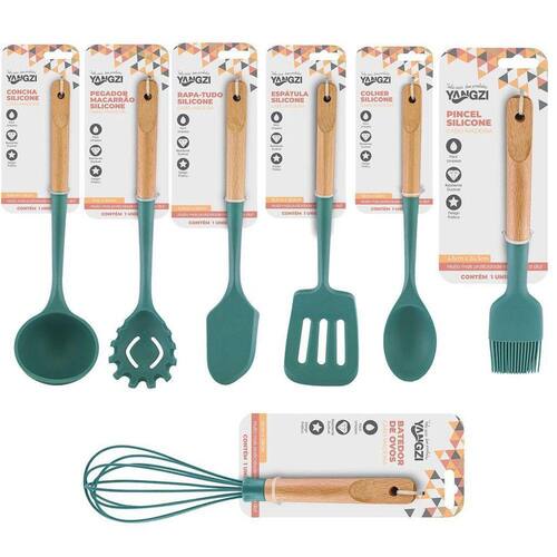 Jogo Conjunto Kit De Colheres De Silicone Cabo Madeira Utensílios Para Cozinha 7 Peças Livre de BpaAlém disso, esse kit são em silicone livre de bpa, sem componentes nocivos à saúde. Com furação para pendurar. É o utensílio de cozinha que não pode falta na sua casa.Quantidade: 7 peças Material: Silicone e cabo madeiraDescrição e Número de Peças:1 Espátula silicone cabo madeiraDimensões: 8,3cm x 33,5cm1 Concha silicone cabo madeiraDimensões: 9,5cm x 34cm1 Pegador de macarrão silicone cabo madeiraDimensões: 7cm x 32cm1 Rapa tudo silicone cabo madeiraDimensões: 5,5cm x 32cm1 Colher silicone cabo madeiraDimensões: 6cm x 33cm1 Batedor de ovos silicone cabo madeiraDimensões: 6cm x 28cm1 Pincel silicone cabo madeiraDimensões: 4,5cm x 24,3cmVantagens do produto:- Não arranha as panelas com revestimento antiaderente como a cerâmica, o teflon entre outros- São resistentes a altas e baixas temperaturas- Não soltam resíduos quando aquecidos- São firmes para proporcionar um melhor preparo do alimento- São fáceis de limpar- São úteis e ainda decoram a sua cozinha com elegância e sofisticação