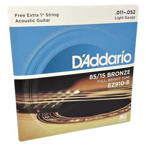 Está a procura de cordas de qualidade para o seu violão A linha de cordas de aço D'Addario vão te surpreender com o brilho no som, sustain e durabilidade. Proporcionam um timbre perfeito por músicos em todo o mundo - Modelo EZ 910-B - Tensão 0.11 - Light leve - Contém 6 cordas de aço + 1 extra - Presas com bolinhas coloridas Marca: Não Informado