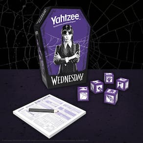 Yahtzee: Jogo de dados de quarta-feira, copo de dados de caixão interior flocado colecionável, jogo clássico baseado no personagem da família Addams Wednesday Addams, jogo e mercadoria oficialmente - Role com Wednesday Addams – Aproveite o charme sombrio de Yahtzee com dados personalizados com símbolos da série Wednesday Netflix. - Copo de caixão edição de colecionador: role seus dados personalizados de quarta-feira em um copo de dados exclusivo em forma de caixão - Embalagem flocada: este conjunto vem em um pacote especialmente projetado com um interior flocado, melhorando a estética gótica. - Inclui 5 dados personalizados de quarta-feira, bloco de pontuação, lápis e regras - Jogo Yahtzee de viagem que você pode levar para qualquer lugar e desfrutar a qualquer momento – 1+ jogadores, a partir de 8 anos, 30 minutos de tempo de jogo