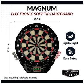 Marca: Hathaway Material: Plástico Cor: Preto/Multicolorido Dimensões do Produto: 52 cm (Largura) x 57,8 cm (Altura) Peso do Produto: 2,27 kg Componentes Incluídos: Tabuleiro de dardos eletrônico, manual de instruções, 6 dardos com ponta macia (pilhas não incluídas) Formato: Retangular Tema: Jogos Dimensões da Embalagem: 62 cm (Comprimento) x 54 cm (Largura) x 6 cm (Altura) Peso da Embalagem: 3,31 kg Modelo: Magnum 15,5-Inch Electronic Dartboard - 20 Games - Soft Tip Número de Itens: 1 Código do Produto: BG1042D Marca: Não Informado