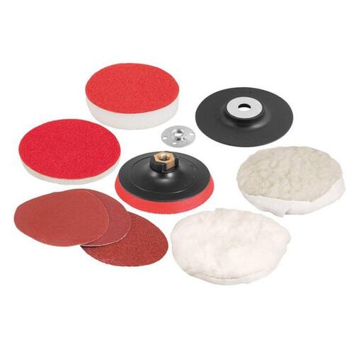 Conteúdo da Embalagem: 1 Jogo de discos para lixamento e polimento com 9 peças, composto por: 1 disco com feltro, 1 disco com espuma, 1 boina de lã sintética, 1 boina de lã natural, 1 disco de lixa grão 40, 1 grão 120 e 1 grão 240, 1 suporte de PVC 4.1/2 com flange (rosca M14) e 1 suporte de PVC com sistema fixa fácil (rosca M14). Indicado para máquinas angulares rotativas de 4.1/2 115 mm, com acionamento elétrico ou pneumático. Ideal para lixamentos e polimentos. Sistema de substituição rápida de acessórios Especificações Técnicas: