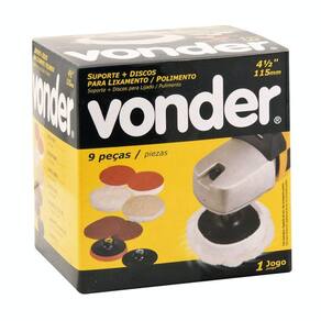 Jogo de discos para lixar e polir 4.1/2 VonderConteúdo da Embalagem: 1 Jogo de discos para lixamento e polimento com 9 peças, composto por: 1 disco com feltro, 1 disco com espuma, 1 boina de lã sintética, 1 boina de lã natural, 1 disco de lixa grão 40, 1 grão 120 e 1 grão 240, 1 suporte de PVC 4.1/2 com flange (rosca M14) e 1 suporte de PVC com sistema fixa fácil (rosca M14). Indicado para máquinas angulares rotativas de 4.1/2 115 mm, com acionamento elétrico ou pneumático. Ideal para lixamentos e polimentos.Sistema de substituição rápida de acessóriosEspecificações Técnicas:Diâmetro externo do jogo de discos para lixamento e polimento: 4.1/2 115 mm Rotação máxima (rpm): 12500 rpm