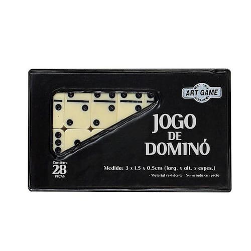 Jogo De Dominó Art Game medidas de cada peça 3 cm X 1,5 cm X 0,5 cm INMETRO: CE-BRI/BRICS00234-15 NM 300/2002 OCP0098 material resistente numerado em preto
