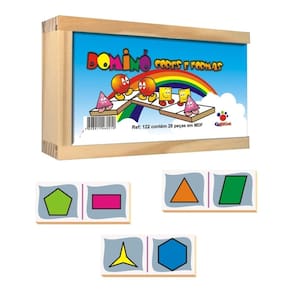 Contém 28 peças de 7 x 3cm, com imagens de formas geométricas em diferentes cores.
