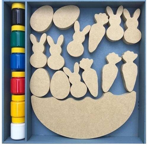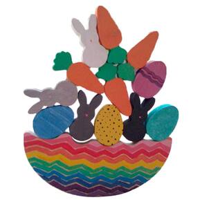Conjunto de peças no tema coelhinho. 14 peças em madeira de reflorestamento, 6 cores de tinta atóxica e pincel para colorir. Além de pintar os personagens e objetos, a brincadeira é conseguir equilibrar as peças