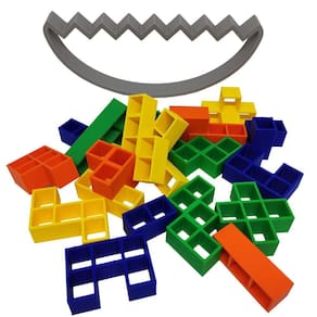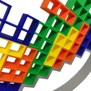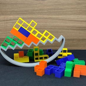 Inspirado no clássico jogo Tetris, este conjunto de blocos é projetado para serem empilhados e equilibrados em uma base móvel.