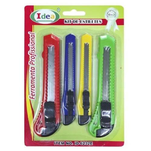 Kit 4 Estiletes Profissional Ideal para um corte preciso em plástico, papel, papelão, isopor e outros materiais. Cuidados- Manusear o produto corretamente.- Manter o produto longe do alcance de crianças.- Após o uso retornar a lâmina para posição de origem.- Descartar as lâminas corretamente. Especificações: Marca:idea Composição:-plástico e aço Contém:4 peças Cor: Medidas:2 com 13cm2 com 15cm Marca: Não Informado