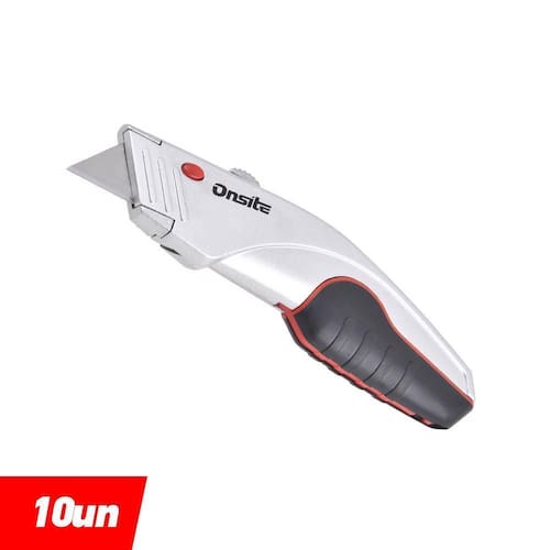 Estilete de Segurança Retrátil 165mm com 5 lâminas Conteúdo: 10x Estilete de Segurança 165mm com 5 Lâminas Onsite Corpo com base metálica e punho emborrachado. Indicado para cortar papel, papelão e outros materiais. A da lâmina é feita de forma manual pela parte traseira do estilete. Código: 711153 Marca: Onsite Tamanho: 165mm 6.1/2'' Ean: 6942629238874 Conteúdo: 10x Estilete de Segurança 165mm com 5 Lâminas Onsite Marca: Não Informado