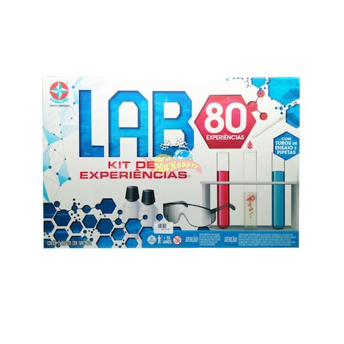 Jogo de Experiências LAB 80 Experiências - EstrelaMisture substâncias, observe as mudanças químicas e se torne um grande cientista com o Lab 80. São 80 experiências para você se tornar um verdadeiro cientista!EspecificaçõesMarca: EstrelaModelo: Jogo da Experiência LAB 80Indicado para crianças a partir de 10 anosQuantidade de Experiências: 80 experiênciasCE-BRI/QB AJ001 NM 300/2002Composição da Embalagem:15 frascos de 10ml para as soluções, com tampa de segurança , sendo 2 unidades opacas.04 Tubos de ensaio com graduação02 Pipetas01 Estante para tudo de ensaio01 escova de limpeza para tubo de ensaio.01 óculos de segurança01 Manual de instruçõesSobre a EstrelaDesde 1937 a Estrela está presente na memória de quem é ou foi criança, formando gerações na convivência com bonecas, carrinhos, jogos, massinha, pelúcias e outros brinquedos. Em 1992, a Estrela fez a adequação do seu Sistema de Qualidade às Normas ISO 9001, recebendo o certificado de Sistema de Qualidade no. CE-SIQ-008/93, tornando-se a primeira empresa do ramo de brinquedos a receber este certificado.