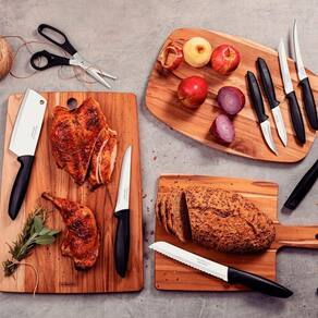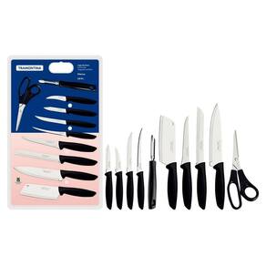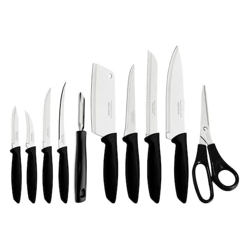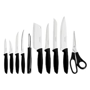 Jogo De Facas 10 Peças Tramontina Plenus 23498065 Preto Tratamento do Talher: Tratamento Térmico;Cor: Aço Inox e Preto;Material: Aço Inox e Polipropileno;Garantia: 90 dias junto ao fabricante;Referência: Polipropileno;Pode ir à Maquina de Lavar Louças? SimItens Inclusos1 Faca para Churrasco / Frutas 5;1 Faca para Tornear 3;1 Faca para Legumes / Frutas 3;1 Faca para Pão 7;1 Faca para Desossar 5;1 Faca Chef 7;1 Faca para Tomate 5;1 Cutelo 5;1 Tesoura para Uso Geral 7;1 Descascador para Batata