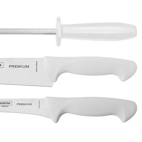 Pegador / Cabo: Polipropileno;Dimensões AxLxP (mm): 38x16x27;Cor: Aço Inox e Branco;Material: Aço Inox e Polipropileno;Garantia: 90 dias junto ao fabricante;Referência: 24499812;Tratamento do Talher: Tratamento Térmico;Itens Inclusos:1 Chaira 8 Premium;1 Faca Utility 8 Premium;1 Faca para Desossar 5 Premium;