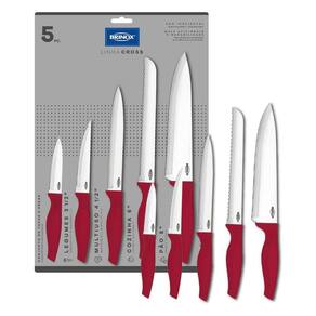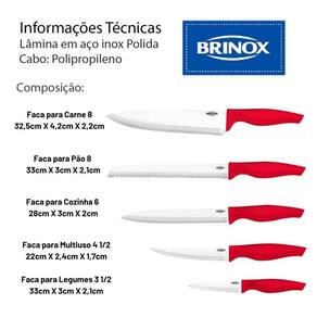 Características do Produto: Material das Lâminas: Aço Inox Material dos Cabos: Polipropileno Quantidade de Peças: 05 Faca para Carne 8 - 32,5x4,2x2,2cm Faca para Pão 8 - 33x3x2,1cm Faca Multiuso 4 - 22x2,4x1,7cm Faca para Cozinha 6 - 28x3x2cm Faca para Legumes 3 - 19,5x2,4x1,8cm