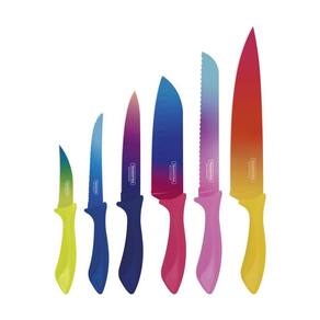 Jogo De Facas 6 Peças Colorcut Aço Inox - TramontinaPara quem ama uma cozinha cheia de estilo e colorida, o jogo de facas Tramontina Colorcut com lâminas em aço inox e cabos de polipropileno pintado 06 peças é a escolha perfeita.Desenvolvido para quem quer fazer bonito na cozinha e garantir alta praticidade e qualidade, ele tem suas facas produzidas com lâminas em aço inox com acabamento pintado que reduz o esforço durante o corte.Os cabos são produzidos em polipropileno, possuem proteção antimicrobiana que inibe o crescimento de fungos e bactérias e tem formato ergonômico, o que proporciona um manuseio muito mais confortável e seguro, pois se adaptam perfeitamente à mão.As peças ainda contam com pintura em cores vibrantes, que vão levar mais alegria e encanto para sua cozinhaCaracterísticas:Lâminas de aço inox com acabamento pintado tornando sua cozinha mais alegre.As lâminas têm maior durabilidade do fio devido ao tratamento térmico.As lâminas possuem maior capacidade de deslizamento reduzindo o esforço durante o corte.Os cabos de polipropileno possuem maior resistência, durabilidade e ergonomia.Os cabos possuem proteção antimicrobiana que inibe o crescimento de fungos e bactérias, proporcionando benefícios em higiene e redução de microrganismos que causam contaminação.Peso: 0,55 kgCódigo - 23099/832 Ean: 7891112278936