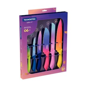 Jogo De Facas 6 Peças Colorcut Aço Inox - TramontinaPara quem ama uma cozinha cheia de estilo e colorida, o jogo de facas Tramontina Colorcut com lâminas em aço inox e cabos de polipropileno pintado 06 peças é a escolha perfeita.Desenvolvido para quem quer fazer bonito na cozinha e garantir alta praticidade e qualidade, ele tem suas facas produzidas com lâminas em aço inox com acabamento pintado que reduz o esforço durante o corte.Os cabos são produzidos em polipropileno, possuem proteção antimicrobiana que inibe o crescimento de fungos e bactérias e tem formato ergonômico, o que proporciona um manuseio muito mais confortável e seguro, pois se adaptam perfeitamente à mão.As peças ainda contam com pintura em cores vibrantes, que vão levar mais alegria e encanto para sua cozinhaCaracterísticas:Lâminas de aço inox com acabamento pintado tornando sua cozinha mais alegre.As lâminas têm maior durabilidade do fio devido ao tratamento térmico.As lâminas possuem maior capacidade de deslizamento reduzindo o esforço durante o corte.Os cabos de polipropileno possuem maior resistência, durabilidade e ergonomia.Os cabos possuem proteção antimicrobiana que inibe o crescimento de fungos e bactérias, proporcionando benefícios em higiene e redução de microrganismos que causam contaminação.Peso: 0,55 kgCódigo - 23099/832